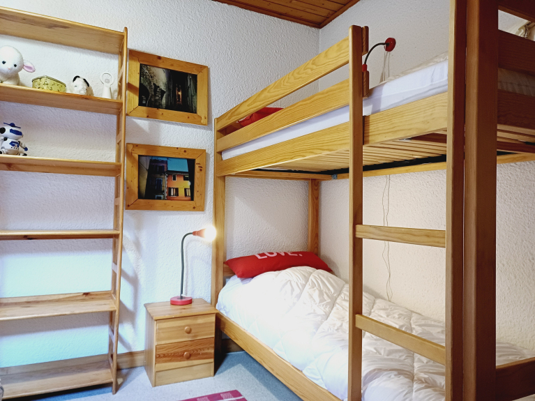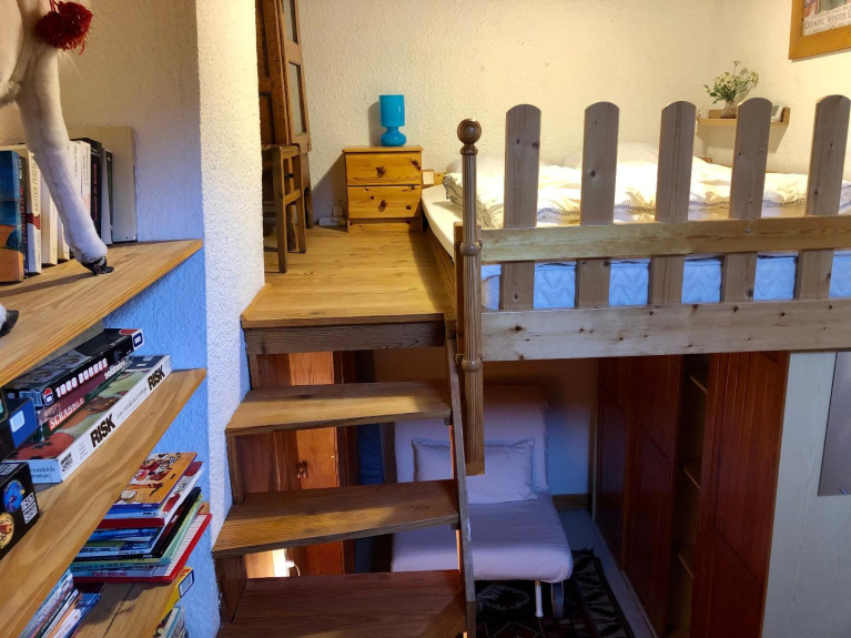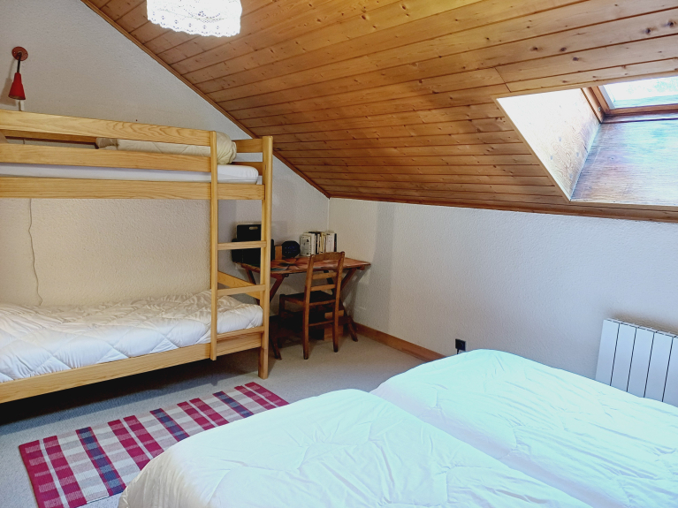 En la primera planta: un dormitorio con una cama doble/mezzanina y una cama individual adicional, un cuarto de ducha, un gran dormitorio con 3 camas individuales.