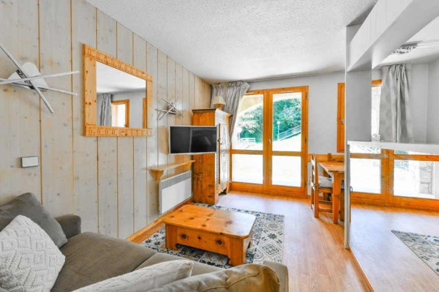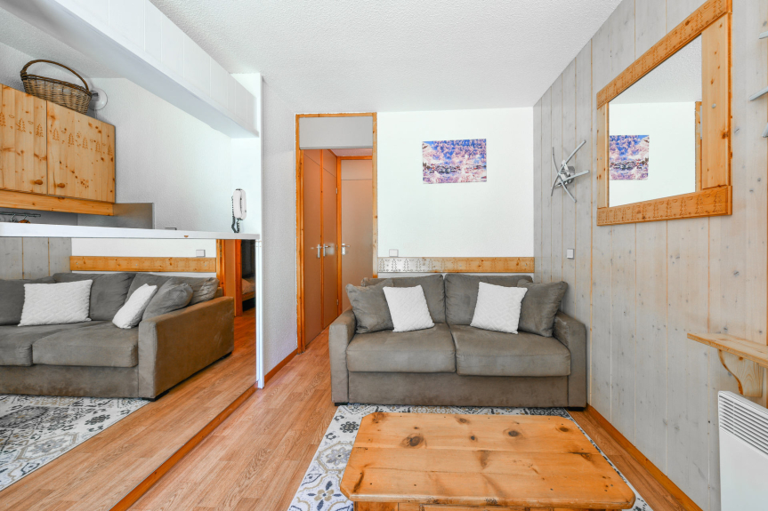 Piso de 2 habitaciones de 30m² para 6 personas situado en el 1er piso de una residencia con ascensor y estando al mismo nivel que el salón que da a una terraza exterior semicubierta.