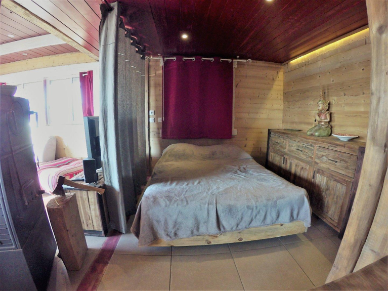 En la planta baja: Detrás del salón, 1 dormitorio (separado por la noche por cortinas) con una cama de 140 cm y un colchón de 12 cm