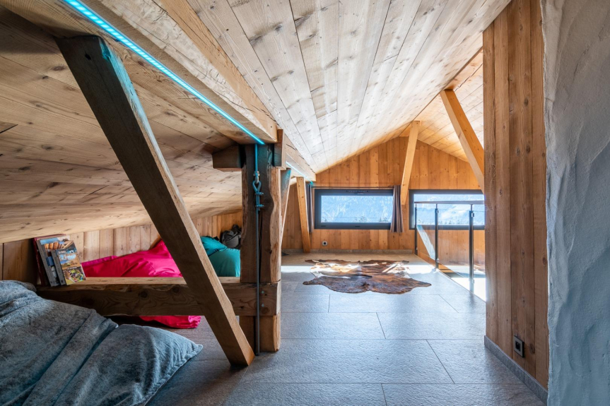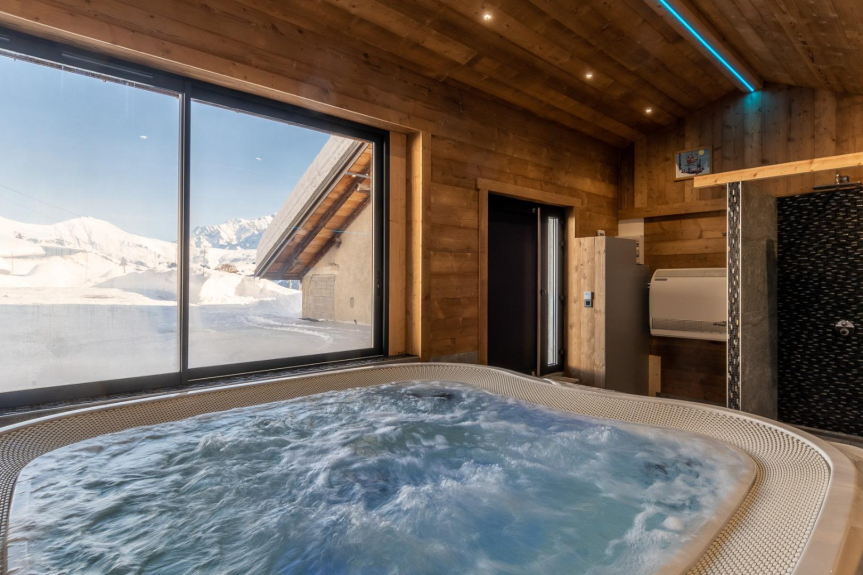 También dispondrá de una zona de ocio y relajación, una sauna de cromoterapia para 4 personas tumbadas u 8 sentadas, un SPA desbordante para 7 personas, ducha, aseo, futbolín y trineo disponibles.