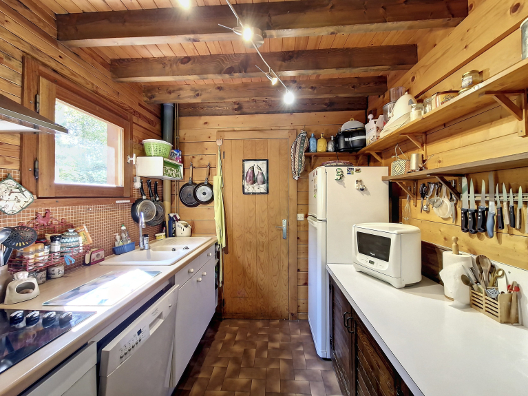 Equipamiento : TV de pantalla plana, reproductor de DVD, horno, lavavajillas, lavadora, placa de 4 fuegos, hervidor de agua, cafetera Nespresso, tostadora, cafetera de filtro, microondas, nevera-congelador, radio CD, robot de cocina, máquina de fondue, secador de pelo, batidora eléctrica, plancha, freidora eléctrica, chimenea, mobiliario de terraza con sombrilla y barbacoa.