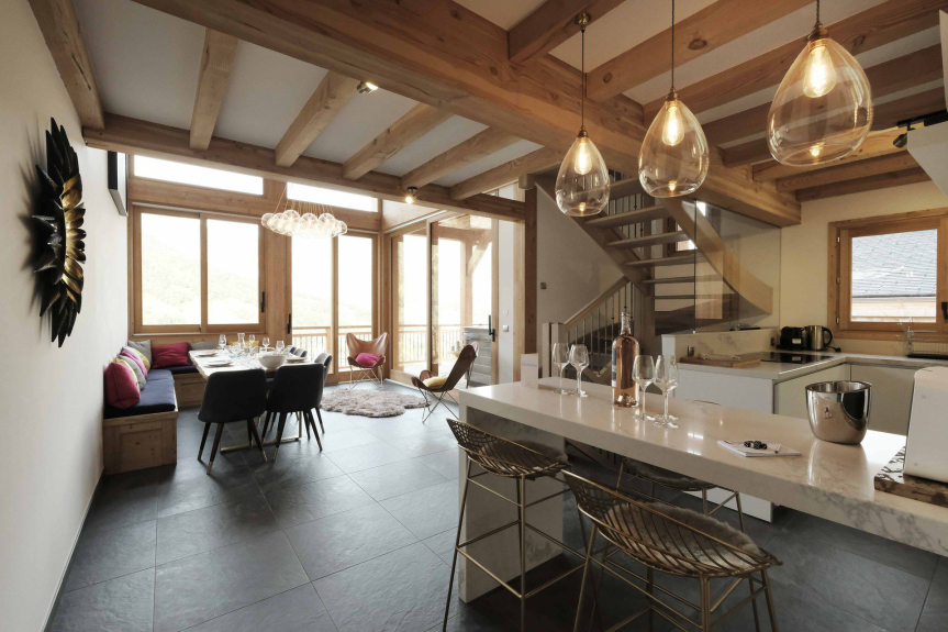 El chalet IBIS VIPERAE, de 130m², situado al pie de las pistas de Saint Martin de Belleville, le ofrece un marco de ensueño para sus vacaciones con amigos o en familia (habitaciones para 12 personas): Amplios espacios abiertos con una magnífica vista de las cumbres, una sutil combinación de decoración moderna y tradición montañesa, sauna, jacuzzi en la soleada terraza. La sala de esquí con sus calentadores de botas se abre a la pista de Saint Martin.