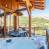Sala de estar con banco de esquina, sillones y estufa de leña que se abre a una terraza de unos 20m² equipada con un jacuzzi, mesa y sillas.