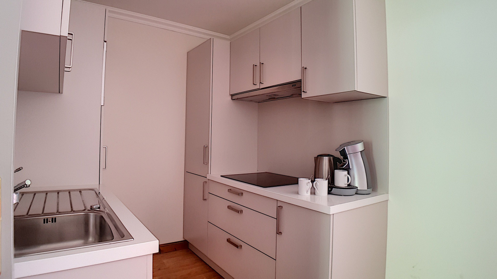 Cocina abierta equipada con 4 placas de inducción, nevera, horno, microondas, lavavajillas.