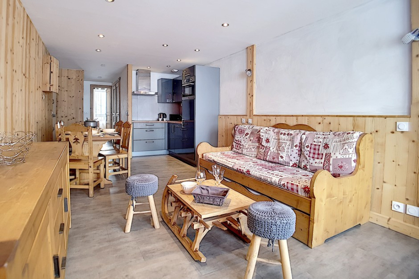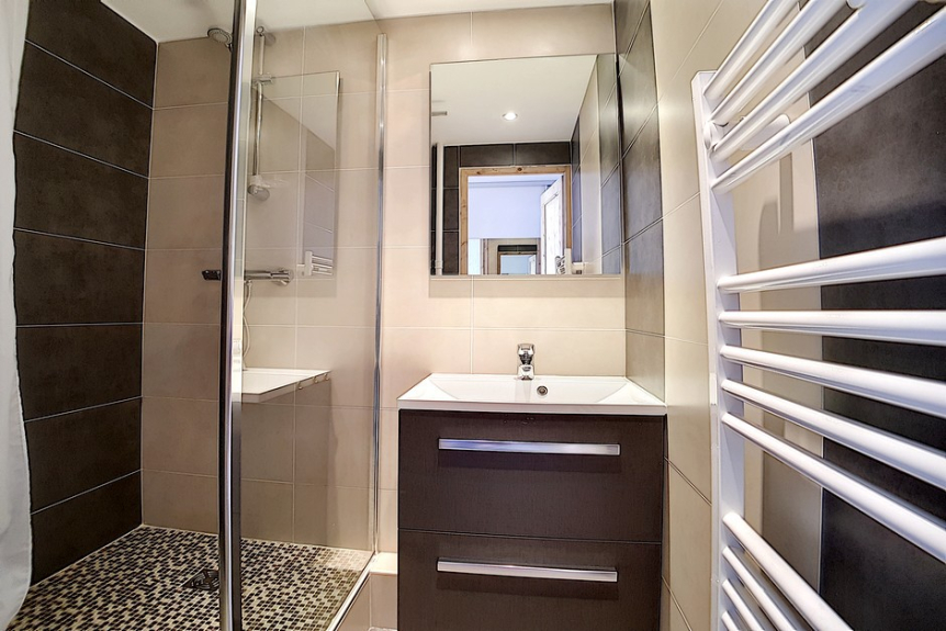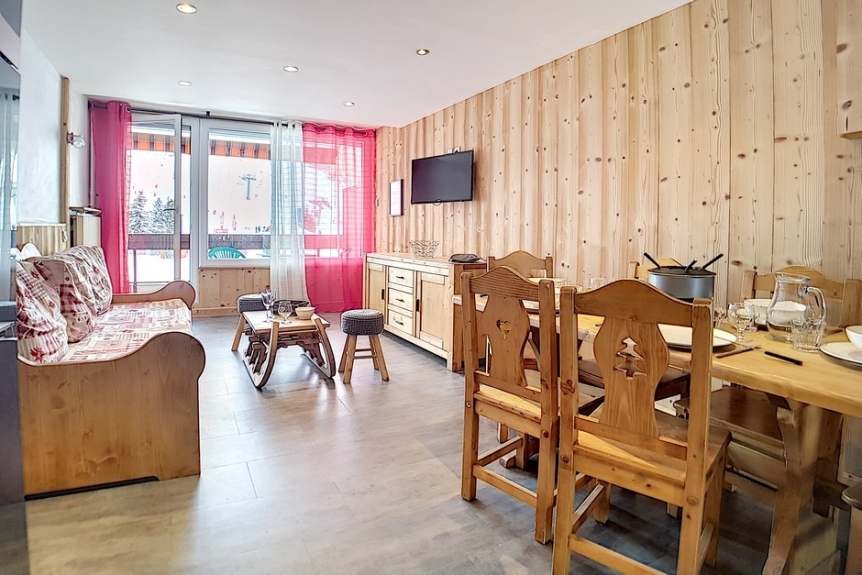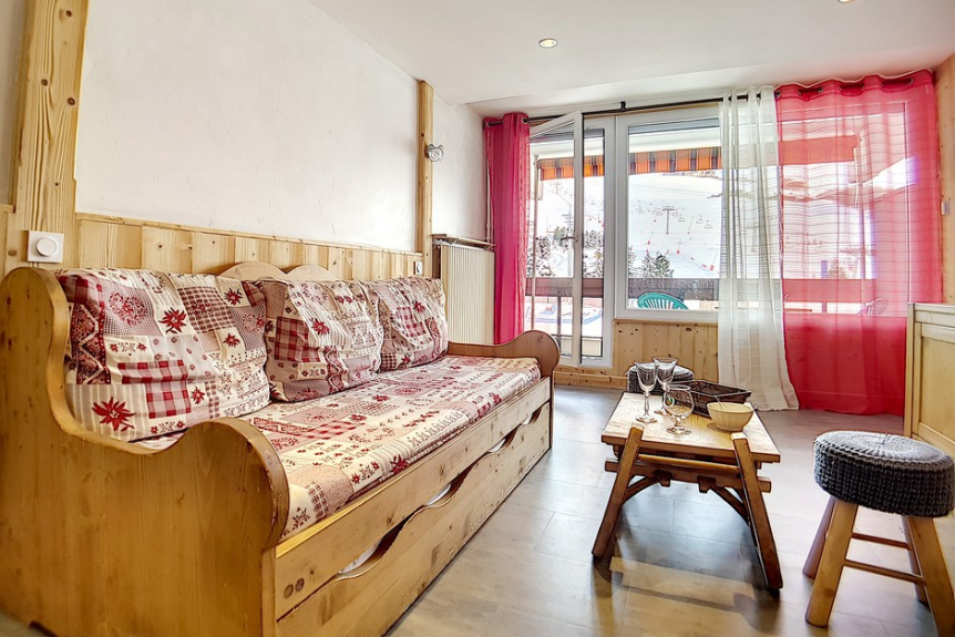 Muy bonito piso completamente renovado, orientado al sureste, con balcón. 38 m² para 5 personas. Se encuentra por encima del centro comercial, en la primera planta de una residencia con esquís.