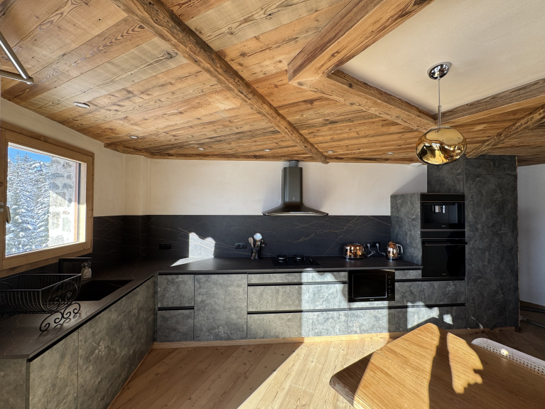 Chalet tradicional construido en la típica arquitectura saboyana, con materiales cálidos, piedra, madera, lauze y una decoración atípica en el interior y el exterior.