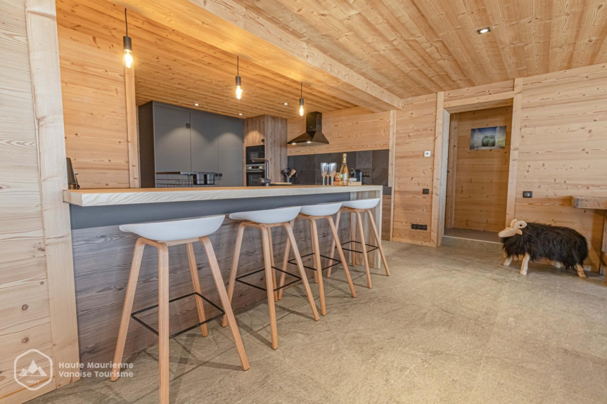 La cocina está equipada con placa de inducción, campana extractora, horno, frigorífico, lavavajillas y pequeños electrodomésticos: hervidor, tostadora, cafetera Nespresso, máquina de raclette, máquina de fondue... vajilla y accesorios de cocina: copas de vino, copas de champán...