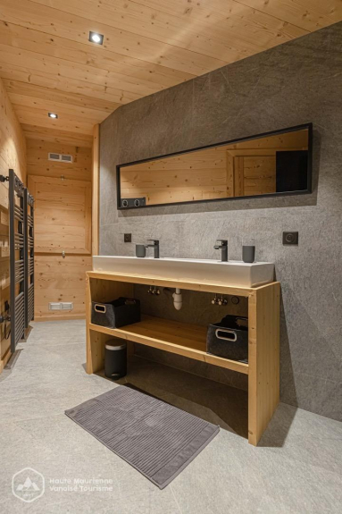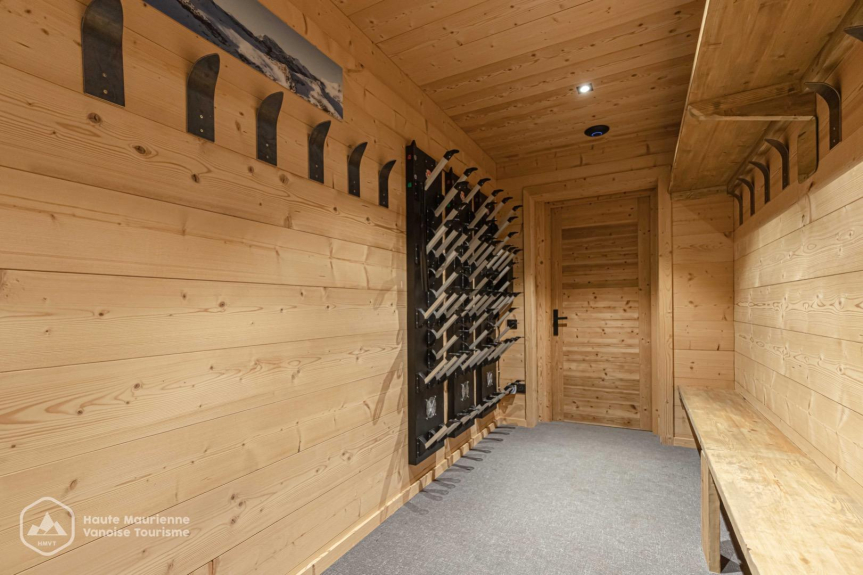 A la entrada del piso encontrarás una sala de esquí para depositar tu equipo, luego te quitarás cómodamente la ropa y los zapatos. Secadores de zapatos, estanterías y puertas mentales están a su disposición para guardar guantes, gorros, cascos y ropa de esquí...