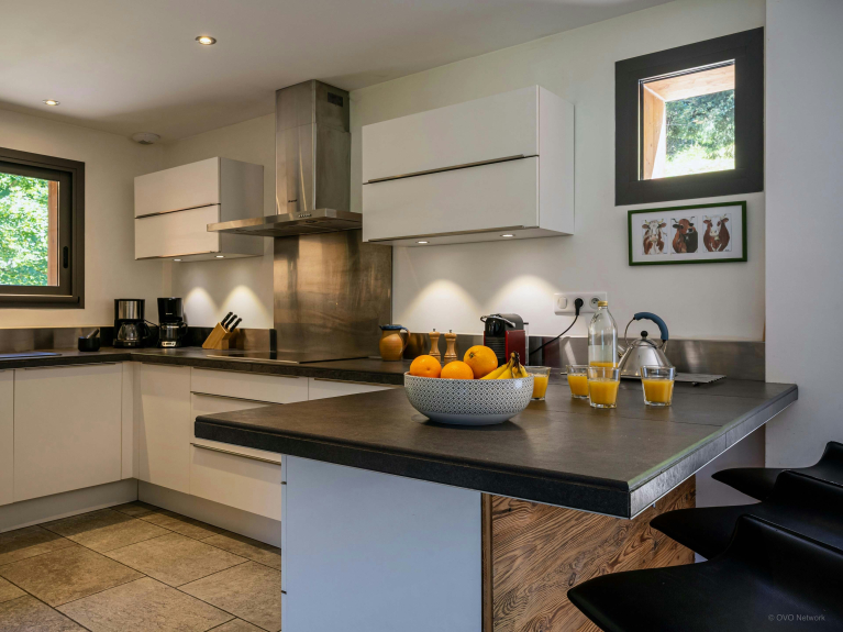 En la siguiente planta, la gran sala común consta de una cocina abierta totalmente equipada, un comedor que da al jardín de la parte trasera de la propiedad y un salón con acceso al balcón y sus espectaculares vistas sobre el valle y la meseta de Beauregard.