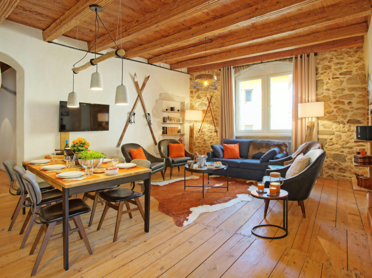 Este piso de segunda planta, renovado con gusto, tiene capacidad para seis personas. La original decoración incorpora madera natural y combina perfectamente el estilo contemporáneo con el carácter de este edificio histórico.