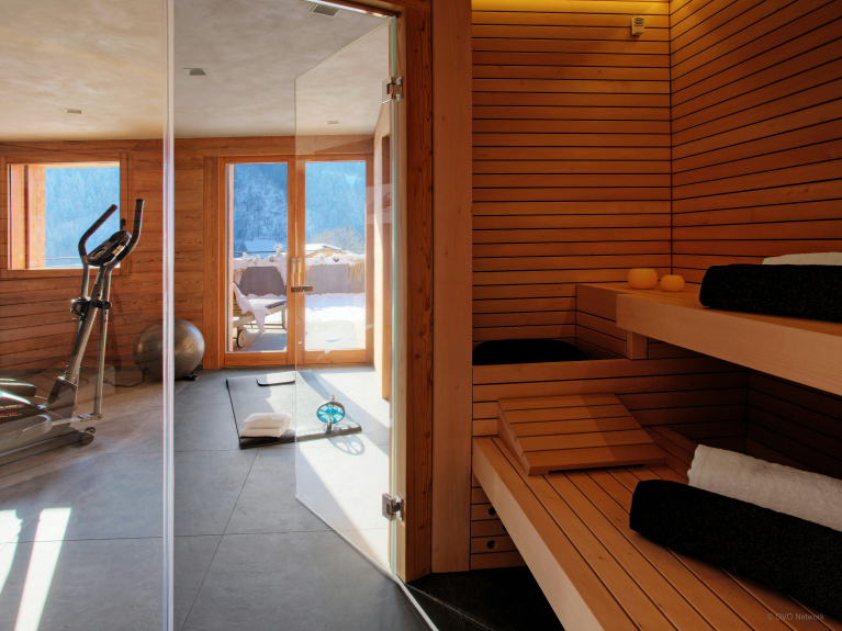 En la planta superior encontrará un gimnasio, una sauna con cuarto de ducha y lavadero, un dormitorio doble con cuarto de ducha en suite y una amplia sala de televisión con sofá incorporado y puertas dobles a la primera terraza. Este soleado lugar es ideal para relajarse en el jacuzzi, respirar el aire fresco de la montaña y disfrutar de las vistas.