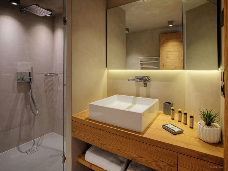 La entrada se encuentra en la planta baja, donde podrá guardar su equipo de exterior en la sala de esquí, equipada con un calentador de botas, o en el gran armario del vestíbulo. También hay un garaje doble en esta planta, para que sus vehículos estén protegidos de la nieve y listos para salir.