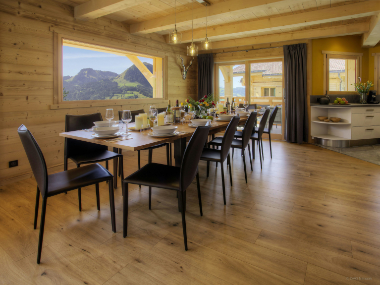 La sala de estar principal se encuentra en el primer nivel. Se trata de una cocina totalmente equipada con una barra donde se puede desayunar. Esta sala diáfana cuenta con un televisor, cómodos sofás y una gran mesa para cenar todos juntos. Esta habitación se abre al gran balcón desde el que se puede disfrutar de las impresionantes vistas del valle y los picos en la distancia. Otro dormitorio doble, un cuarto de ducha y un aseo separado también se encuentran en este nivel.