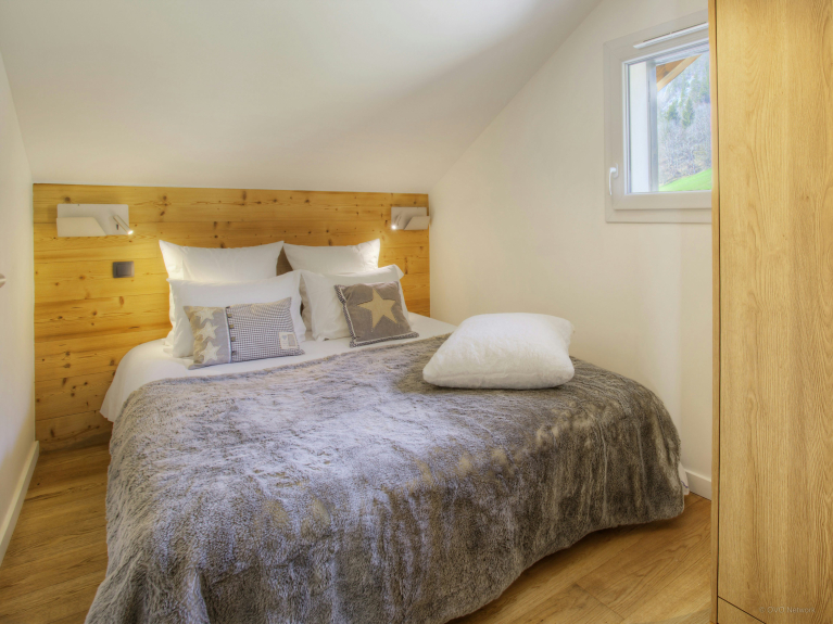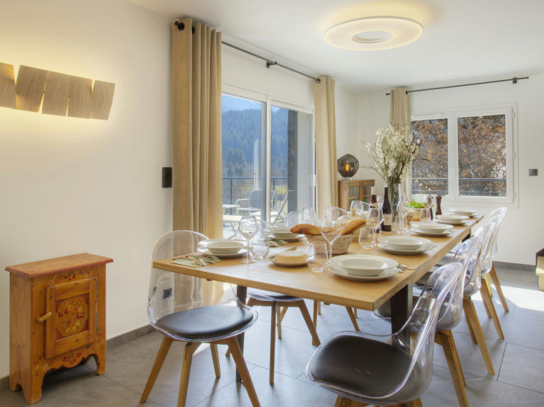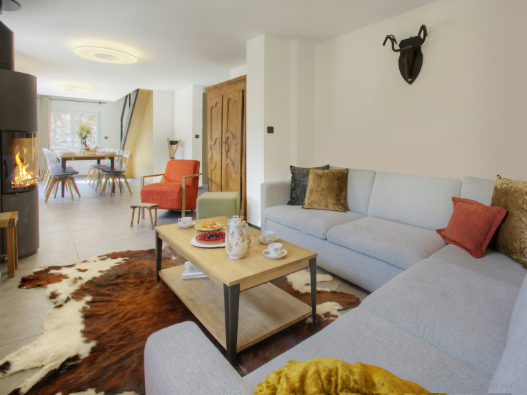 El alojamiento se distribuye en dos niveles. La zona de estar se encuentra en la planta baja, mientras que los cuatro dormitorios están en la primera planta. La cocina, totalmente equipada, es elegante y práctica, y cuenta con una barra. Una ventana francesa se abre al balcón. Una ventana francesa se abre al balcón, donde podrá disfrutar de su café matutino mientras admira la hermosa vista y respira el aire fresco de la montaña. El comedor también tiene un ventanal que da acceso a la amplia terraza. Aquí podrá disfrutar de un aperitivo, preparar una barbacoa o simplemente tumbarse en una tumbona para tomar el sol, contemplar las vistas y relajarse.El acogedor salón está dispuesto alrededor de una estufa de leña. La planta baja también incluye una sala de juegos dedicada con un televisor y una consola PS4, donde a los huéspedes más jóvenes les encantará pasar el rato y divertirse juntos sin los adultos.Este es también el nivel donde se encuentra la sala de lavandería, la sala de esquís y bicicletas y un aseo separado.En la planta superior se encuentran cuatro dormitorios. Un dormitorio con dos camas y dos dormitorios dobles, uno de los cuales tiene un cuarto de ducha en suite. También hay un dormitorio encantador y muy luminoso con tres camas individuales. Es ideal para los niños. También hay un baño familiar en este nivel y el chalet tiene tres plazas de aparcamiento, una de ellas cubierta.