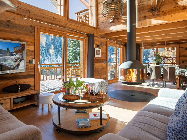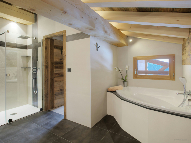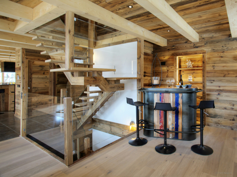 El espacio vital se distribuye en tres niveles. La entrada está en el primer nivel. Tiene acceso al gran garaje doble, que es muy espacioso para guardar las bicicletas y los esquís, y a la sala de esquí con un porta botas calentado. En el primer nivel también hay un gran salón con zonas de comedor y cocina. Grandes ventanales y puertas se abren al amplio y bien expuesto balcón que se extiende por un lado y el frontón del chalet. En la moderna y bien equipada cocina hay comida para todos. Hay una gran nevera americana para mantener las bebidas frías y una barra para el desayuno, y la mesa es lo suficientemente grande como para compartir una comida juntos. Y después de la cena, relájate en los cómodos sofás para ver una película o tomar una copa en el bar.4 de las 5 habitaciones están en el nivel del jardín y tienen acceso a una terraza. Tanto en verano como en invierno, abra las puertas a primera hora de la mañana para que entre el aire fresco de la montaña; ¡una forma estupenda de empezar el día! Tres de las habitaciones son dobles y la cuarta es una habitación infantil, equipada con literas, una cama individual y un cuarto de baño con ducha. El quinto dormitorio es una espaciosa suite en el nivel superior. Además de su amplísimo baño en suite, este lujoso espacio cuenta con un vestidor y un balcón con vistas espectaculares. Las tres plantas están conectadas por una elegante escalera de madera y cristal que permite el paso de la luz.