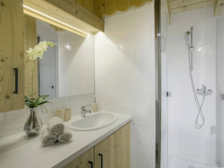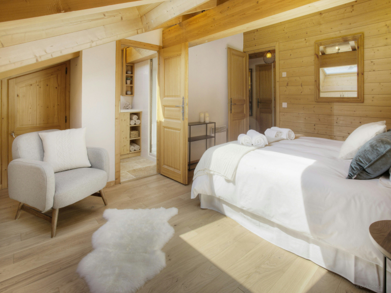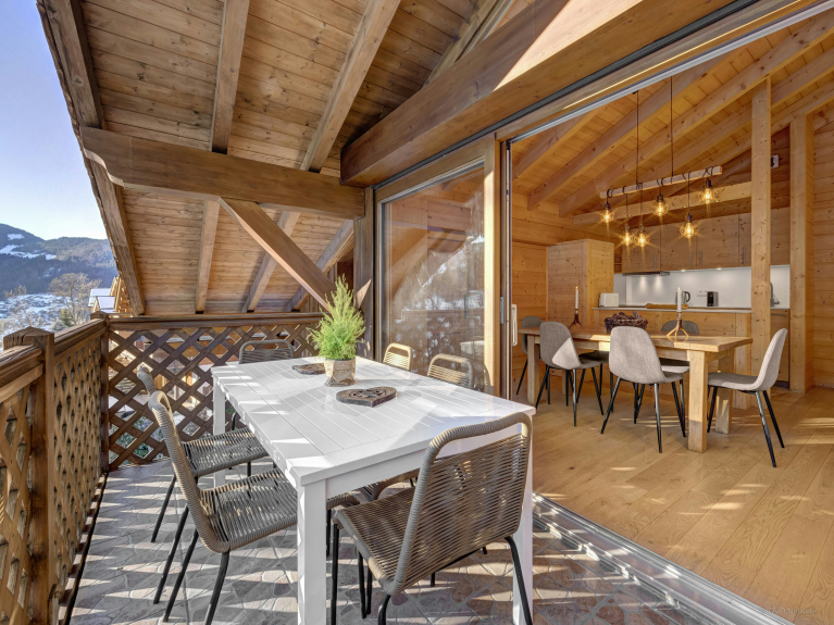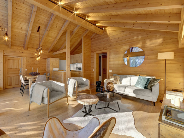 El piso ocupa todo un nivel del chalet, que tiene otros cuatro pisos. La sala de estar es completamente abierta y es particularmente espaciosa, ya que abarca todo el ancho del piso y se abre a un balcón soleado orientado al sur. Es un lugar maravilloso para relajarse, disfrutar de su café matutino o contemplar la magnífica puesta de sol sobre el macizo de Aravis mientras se toma una copa de vino.