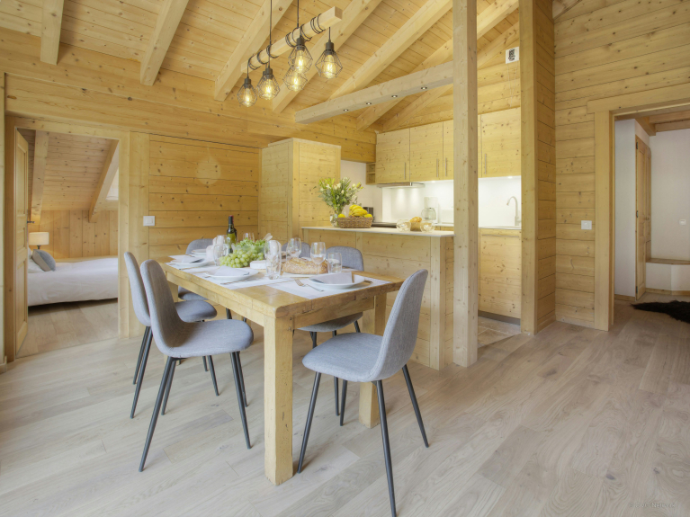 Este luminoso piso, situado en una zona tranquila, tiene tres dormitorios y dos cuartos de ducha, por lo que puede alojar hasta cinco personas. Por lo tanto, puede albergar hasta cinco personas. Las recientes obras de renovación han dado lugar a una nueva cocina y cuartos de ducha. El piso también ha sido reformado con tonos neutros y mobiliario moderno para realzar su estilo alpino tradicional.