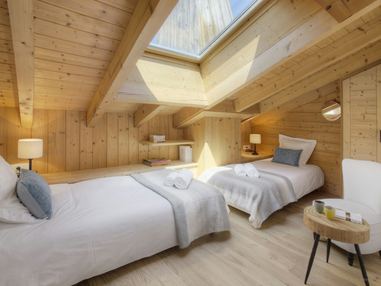 El piso tiene tres habitaciones: una doble con ventana Velux y cuarto de ducha en suite, una habitación doble con vistas a las montañas y una habitación individual con vistas a las colinas. Hay un segundo cuarto de ducha y un aseo separado.