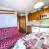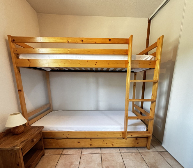 - Alojamiento: un dormitorio con una cama doble (140), un dormitorio con literas (2x90), sala de estar con un sofá cama doble (140). Ropa de cama con edredones y mantas.