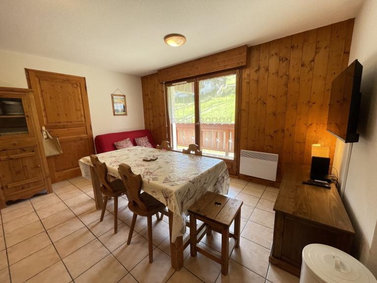 Piso de dos dormitorios de 38m² en la primera planta de una residencia a pie de pistas con un balcón orientado al sur que ofrece una hermosa vista del frente de nieve.