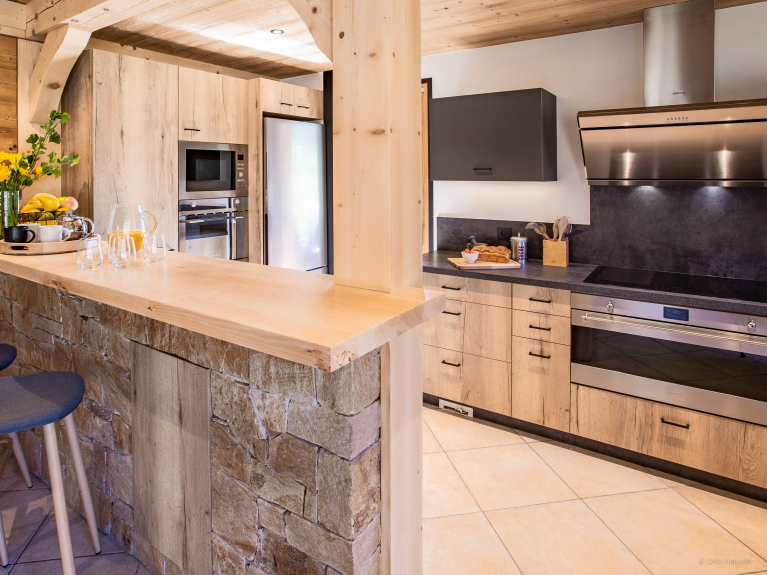 La sala de estar principal en la planta baja ocupa todo el ancho del chalet y aprovecha al máximo las vistas sobre el hermoso valle. Hay una impresionante estufa de leña entre el salón y el comedor, un gran sofá con chaise longue y sillones para ver la televisión. Hay una gran mesa de comedor para que todos coman, y la cocina tiene un gran horno y una barra. Las ventanas francesas se abren a la terraza amueblada y al jacuzzi del jardín, que incluye una pista de petanca y tiene unas vistas magníficas del valle.