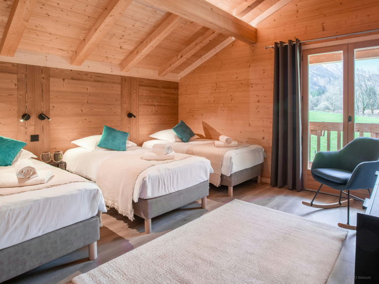 Hay dos dormitorios en la parte trasera del chalet. Una es una habitación doble con cuarto de baño con ducha y aseo separado, y otra es una habitación triple con tres camas individuales y cuarto de baño con ducha.