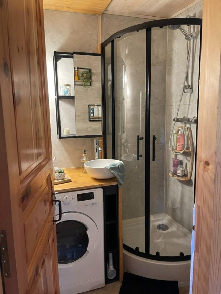 Un cuarto de baño: ducha, lavabo, secador de pelo, secador de toallas.
