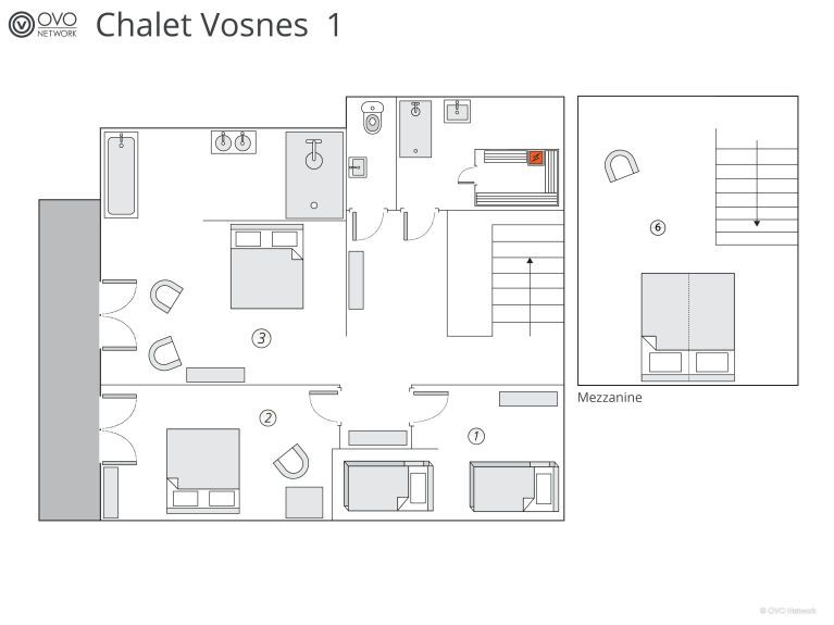 La zona de estar del chalet Les Vosnes se distribuye en tres niveles y un altillo. Hay mucho espacio para un grupo de 14 personas, incluyendo seis dormitorios y cinco baños.