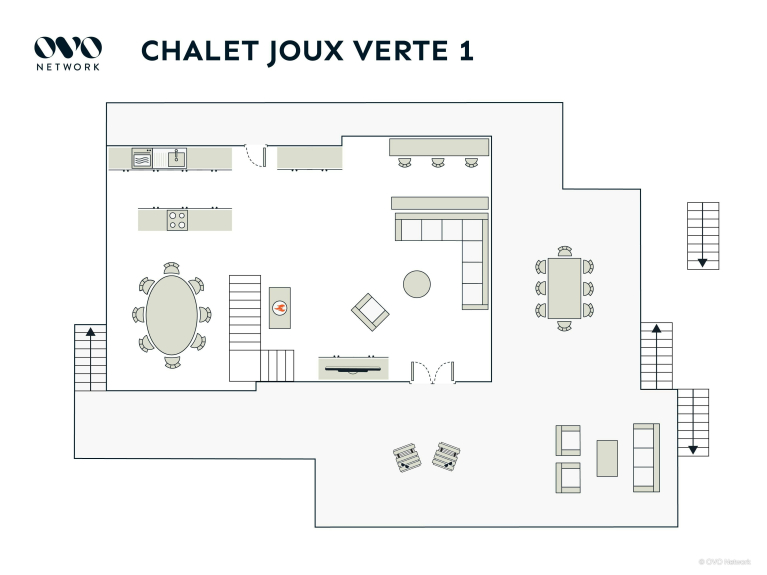 La sala de estar principal está en el piso de arriba. En la moderna cocina encontrará todos los utensilios necesarios para preparar deliciosas comidas después de un ajetreado día en la montaña. Esta cocina tiene dos hornos y una placa en la isla. Podéis disfrutar de vuestras comidas juntos en la mesa ovalada con sillas de cuero.