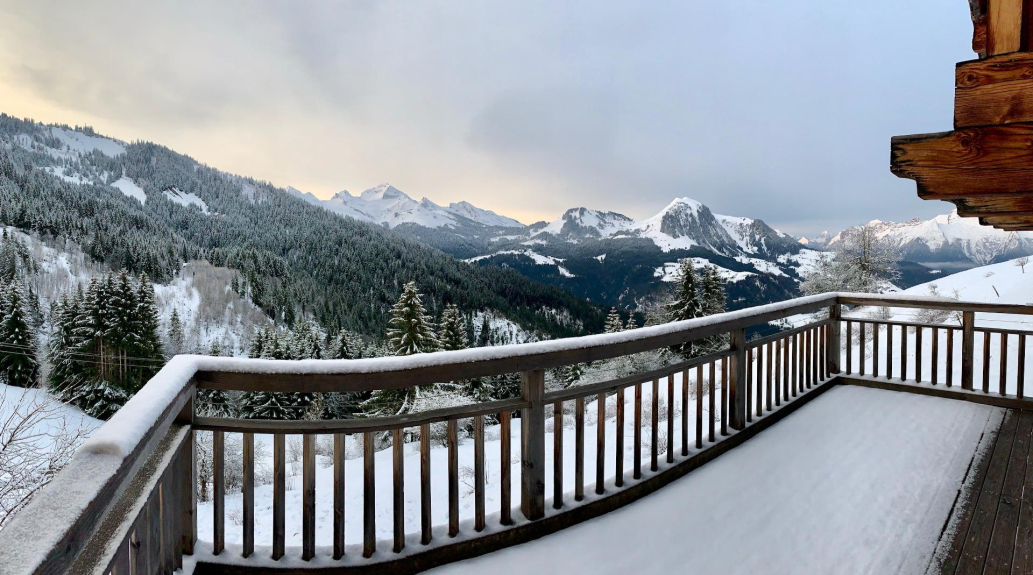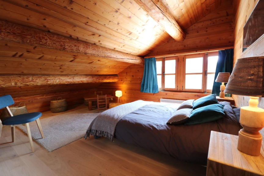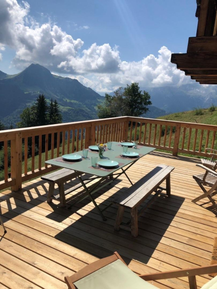 Elegante chalet tradicional de 170m² en 3 niveles, orientado al sur con una impresionante vista del valle de Manigod desde la gran terraza.