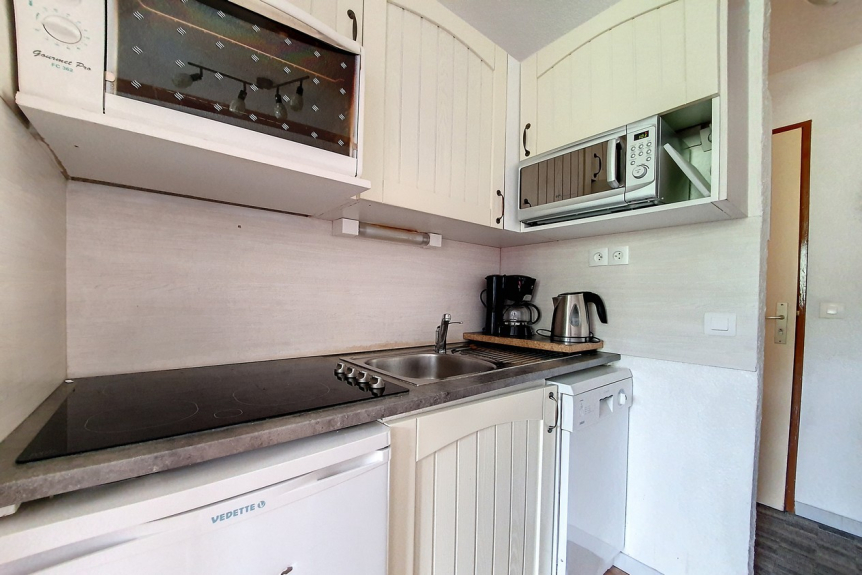 Cocina integrada con 2 placas de cocción, microondas, nevera, lavavajillas, hervidor, tostadora y cafetera.