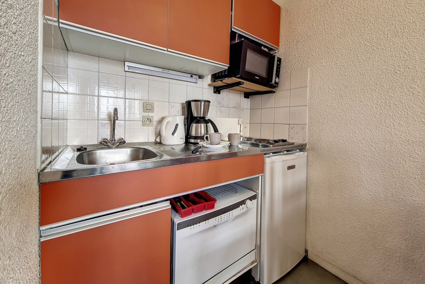 Cocina equipada con 2 placas de cocción, microondas, nevera, lavavajillas, hervidor, cafetera y tostadora.