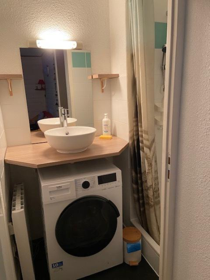 - Un cuarto de baño con ducha, lavabo y lavadora-secadora.