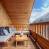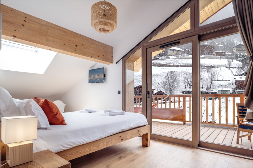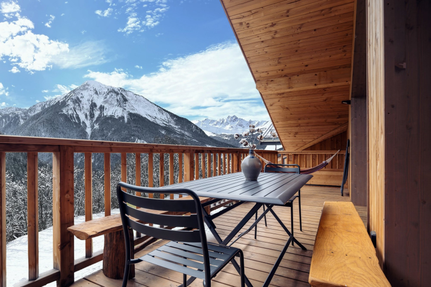 En el lado del salón, un gran balcón de 20 m² con vistas a las montañas y a Courchevel. Equipamiento: mesa y sillas de exterior, tumbonas.