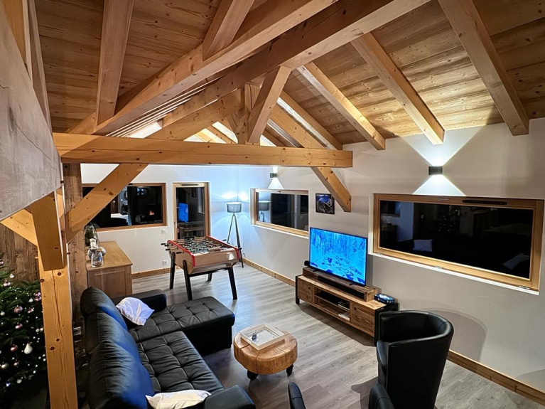 * Salón: sofá cama, 1 sillón, mesa de centro, TV 125 cm en mueble, estufa de pellets (suministrada), reproductor de DVD y Blu-ray, futbolín