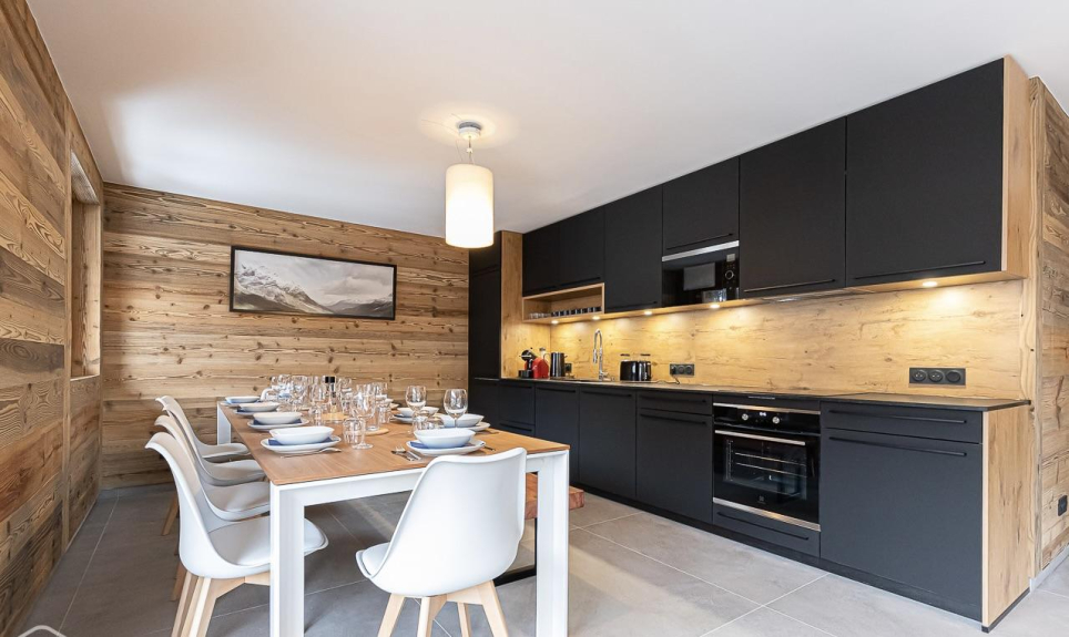 una gran cocina equipada (lavavajillas, placa de cocción, nevera grande, mucho espacio de almacenamiento)