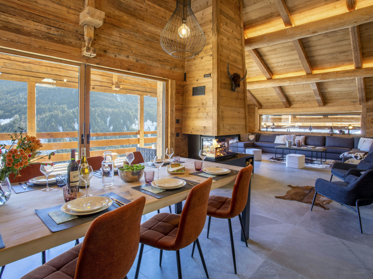 El hermoso salón principal se encuentra en la segunda planta. Sus grandes ventanales iluminan perfectamente esta habitación y se abren a una soleada terraza cubierta, permitiéndole aprovechar la impresionante vista de las montañas de Aravis.