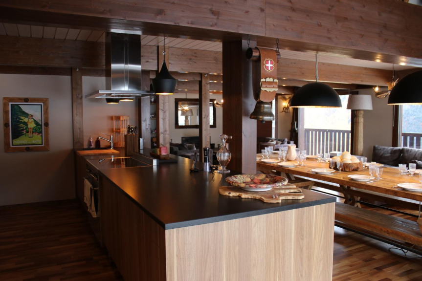 En la primera planta, una gran cocina totalmente equipada se abre a un comedor ideal para un gran número de invitados en verano e invierno, desde el que se accede directamente a la terraza con vistas al Mont Blanc.