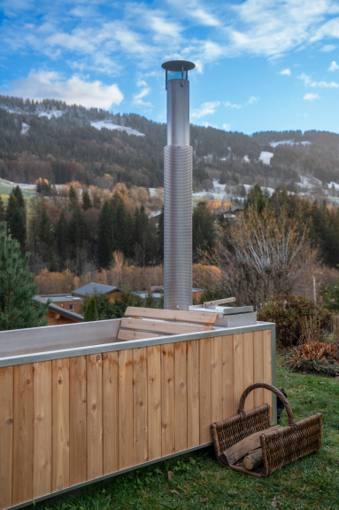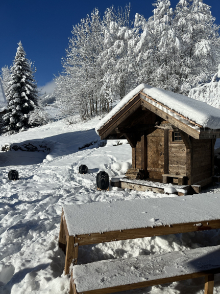 El chalet se abre a un gran salón totalmente vestido de madera natural. Cálido e íntimo con sus elegantes muebles, sus acogedoras alfombras y cojines, su decoración de estilo montañés, alberga un salón con biblioteca y chimenea, un comedor convivial y una cocina moderna. Grandes ventanales ofrecen una vista despejada del Val d'Arly.