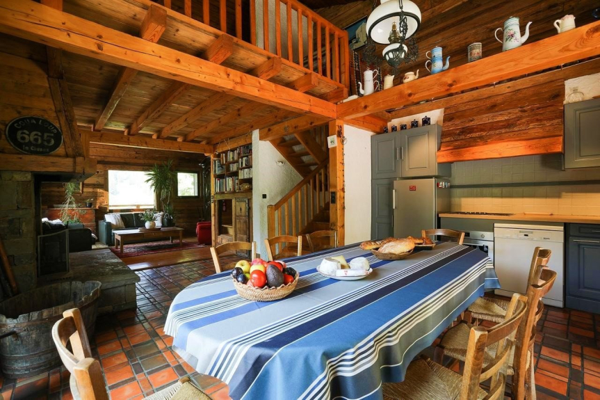 • Amplio salón de más de 50m² con chimenea que incluye zona de comedor, cocina equipada (nevera, lavavajillas, cocina con horno de pirólisis programable, horno microondas, juegos de raclette y fondue disponibles, etc.) y un bonito espacio salón con sofás y sillones .