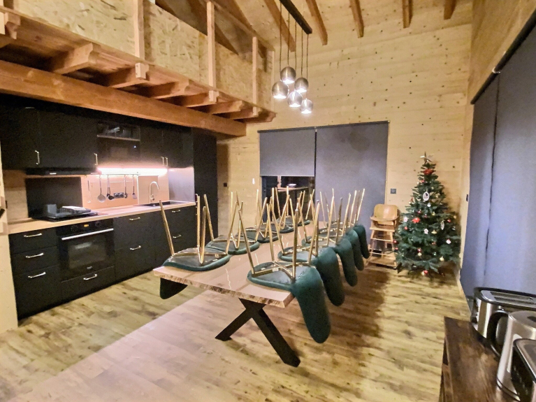 Amplio y acogedor salón con cocina abierta totalmente equipada (LV, horno, nevera, congelador, microondas, etc.) con capacidad para 10 personas como máximo. con una sala de estar para pasar una noche de cine (pantalla + videoproyector, cine en casa), 1 aseo independiente, lavadero (LL/SL)