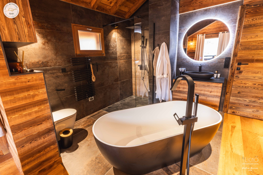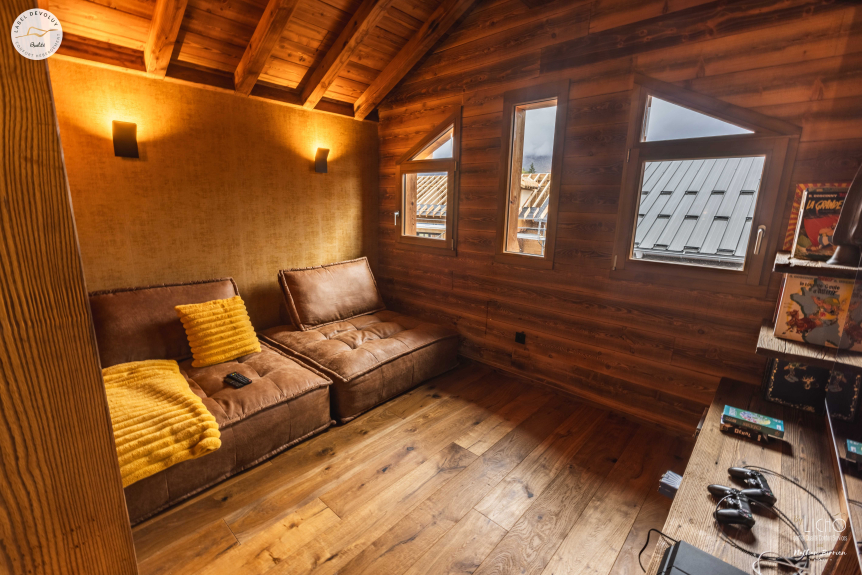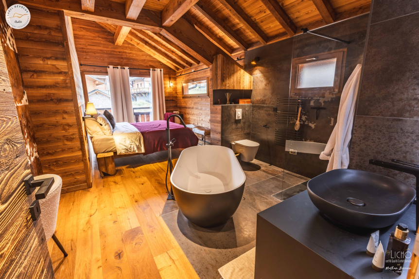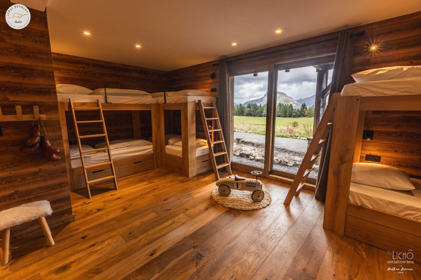 Alojamiento de prestigio: "Le Chaby" es una dirección donde el confort y el refinamiento alcanzan nuevas cotas. Imagínese en la intimidad de cuatro habitaciones individuales (cama de 160 cm), cada una equipada con un escritorio y un vestidor, así como su propio cuarto de ducha y aseo privados. Le espera un espacioso dormitorio para ocho personas, con dos cuartos de ducha, un aseo y un ingenioso espacio de almacenamiento. La confortable suite principal de 24 m² combina un estudio, un vestidor, un cuarto de ducha, un baño y un aseo privado para su bienestar.