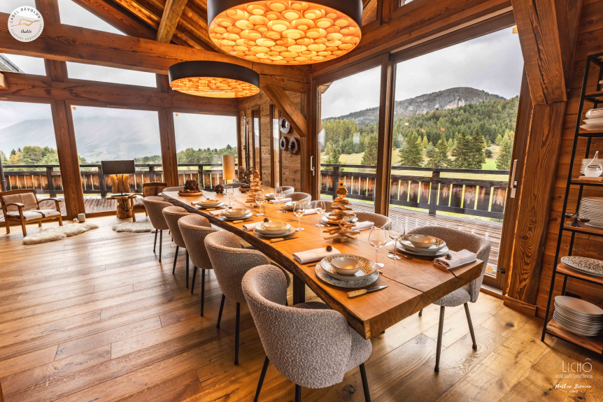 Momentos de convivencia, espacios de vida excepcionales: nada más atravesar la entrada de madera antigua, quedará encantado por los refinados detalles y características de este chalet. La elegante escalera le guiará a través de dos plantas de puro confort. El corazón del chalet late en el amplio salón de 76 m² con su chimenea "Focus" suspendida, que ofrece un espacio para relajarse y compartir; déjese encantar por las impresionantes vistas panorámicas sobre la meseta desde los enormes ventanales. La terraza de 74 m² amplía el espacio de vida, proporcionando el escenario perfecto para momentos memorables. Disfrute de la sala de TV con acceso a canales internacionales. Cada habitación está equipada con una toma RJ45 para una conectividad perfecta. La calefacción por suelo radiante añade un toque de confort.