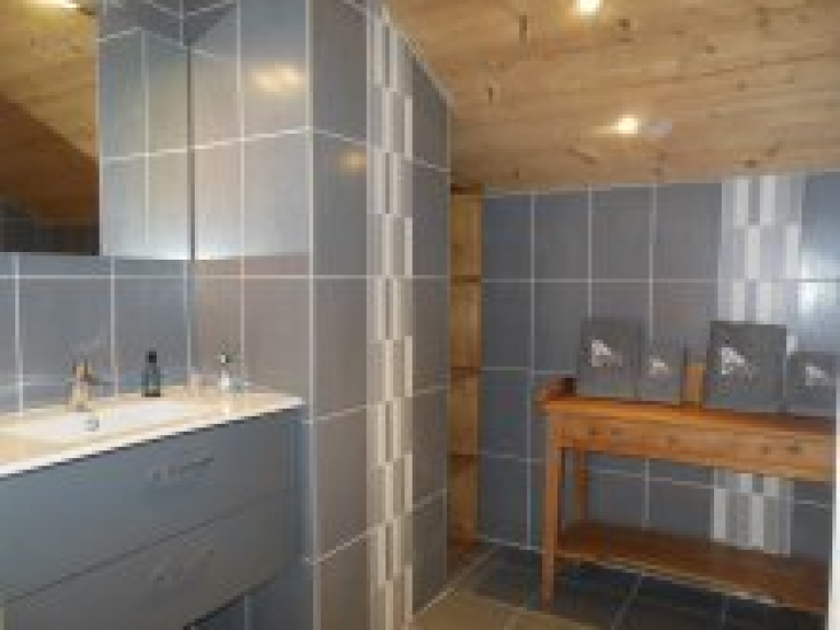 Una segunda habitación dormitorio / suelo de madera, 14 m², para 3 a 5 personas, camas 90cms x 2m, sillas, velux y su cuarto de ducha / suelo de baldosas, 5 m², con ducha italiana muy espaciosa, lavabo, espejo, espacio de almacenamiento, radiador toallero y secador de pelo de pared.