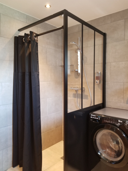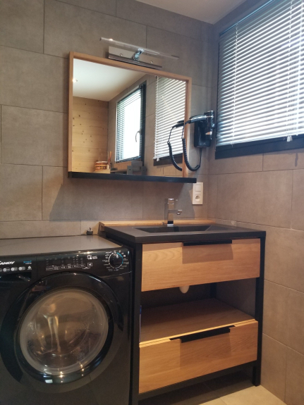 en la planta baja, un amplio hall de entrada para guardar zapatos y chaquetas 7m², una sala de lavandería independiente con lavadora, secadora, tendedero, sala de calderas y escalera 7m², gran planta baja dormitorio estudio de 27m² (acceso para minusválidos) con 1 cama 180 - o 2 camas individuales 90), sofá cama 1 persona, mesa de comedor, sillas, cocina americana totalmente equipada, TV, cuarto de baño: unidad de lavabo, ducha italiana, lavadora secadora, secador de toallas.