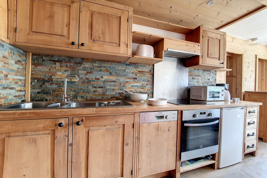 Cocina equipada con 4 placas vitrocerámicas, horno, microondas, frigorífico con congelador integrado (5L), lavavajillas, cafetera, tostadora y hervidor de agua.