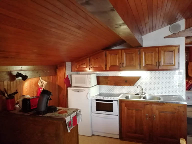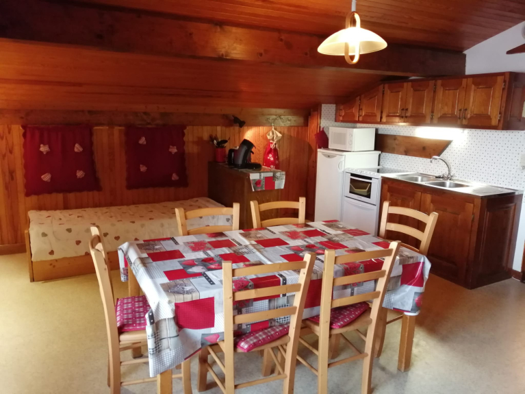 Un dormitorio con un gran armario, una cama de 140 cm, una cocina totalmente equipada con lavavajillas, máquina de crepes fondue raclette, nevera-congelador, un sofá cama de 140 cm con colchón de verdad, camas nido de 90 cm, un gran balcón orientado al sur con tumbonas y vistas al Mont Bisanne y al Beaufortin.