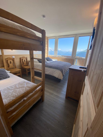 Espléndido piso de 78 m² (4/5 habitaciones) con doble exposición totalmente renovado, capacidad para 9 personas, 3 habitaciones, una de ellas con balcón de 2,5 m² con vistas al Mont Blanc, 2 baños, 2 aseos, gran salón con cocina americana.