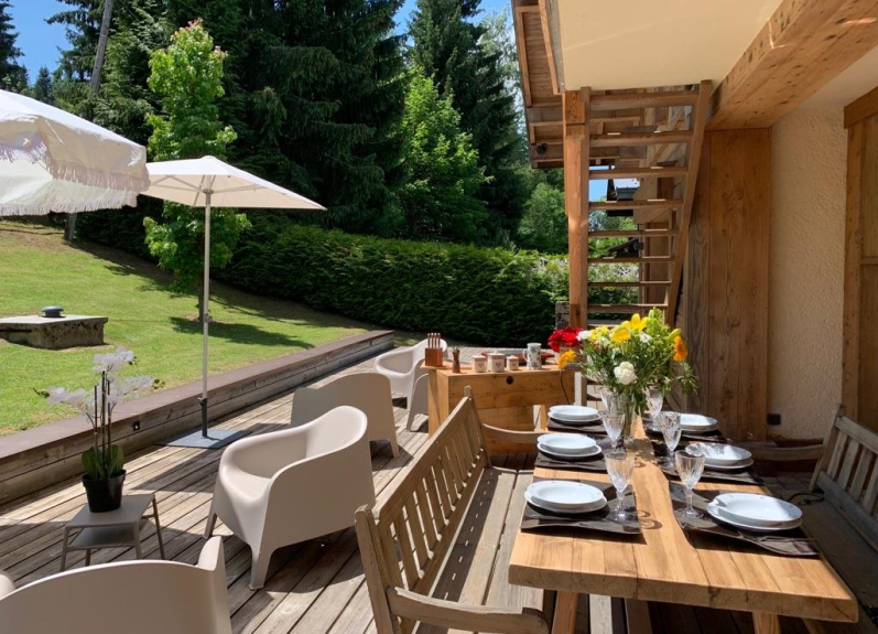 En verano, disfrute de la gran terraza con vistas al jardín arbolado del chalet, con tumbonas para relajarse o tomar el sol, y un campo de petanca para jugar a la petanca con los amigos.
