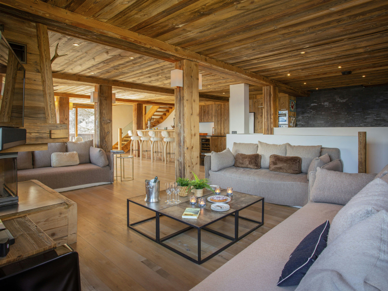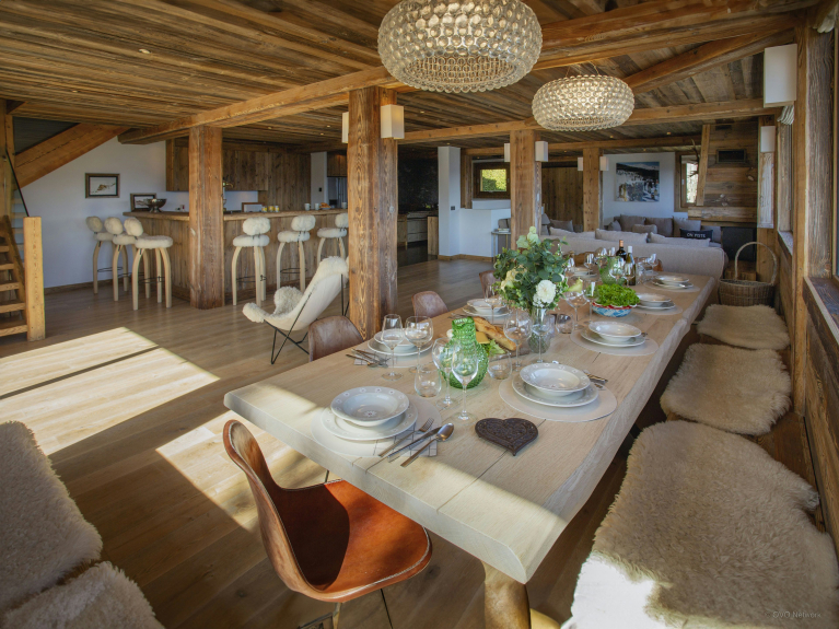 La zona de estar cuenta con un amplio y confortable salón con chimenea y televisión. El gran bar, la bodega eléctrica y el surtidor de cerveza recuerdan la antigua identidad de la propiedad. La gran mesa de comedor reunirá a todo su grupo para disfrutar del paisaje alpino.